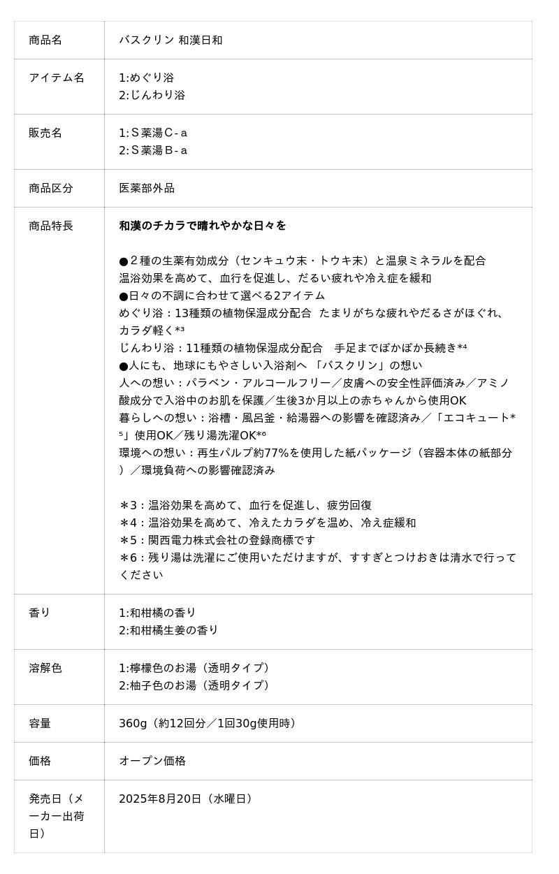 株式会社バスクリン(本社:東京都千代田区 社長:三枚堂正悟)は、和漢のチカラで日々の“なんとなく不調*¹”を和らげる薬用入浴剤「バスクリン 和漢日和」シリーズを8月20日(水曜日)より新発売いたします。2種の生薬有効成分(センキュウ末・トウキ末)と温泉ミネラルに加え、10種類以上の植物保湿成分を配合。たまりがちな疲れやだるさが気になる方に向けた「めぐり浴」と、手足の冷えが気になる方におすすめの「じんわり浴」の2アイテムを展開いたします。和漢の恵みを取り入れた入浴で、カラダの巡りをととのえ*²、気分もカラダも晴れやかに軽く*³なるような毎日をサポートします。
