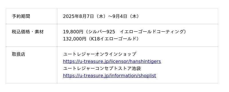 株式会社ユートレジャー(本社:東京都新宿区、代表取締役社長:青木 興一、株式会社ケイ・ウノの連結子会社)は、2025年に球団創設90周年を迎える阪神タイガースとコラボレーションした「サインネックレス」を発売します。2025年8月7日(木)~9月4日(木)の期間、ユートレジャーオンラインショップ、ユートレジャーコンセプトストア池袋にて予約受付を行います。ユートレジャーでは初めての取り扱いライセンスとなります。