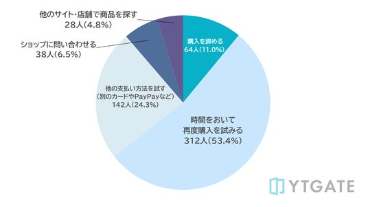 – 決済エラー発生時の対応として、再度購入を試みる人が53.4%と過半数を占め、次いで他の支払い方法を試す(24.3%)や購入をあきらめる(11.0%)といった行動も一定数存在した。