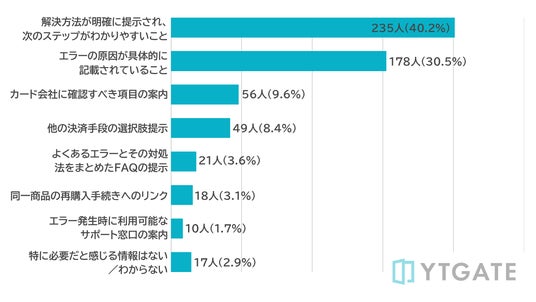 – 決済エラー時に最も重視される情報は、解決方法が明確に提示されること(40.2%)で、次にエラー原因の具体的な記載(30.5%)が求められた。