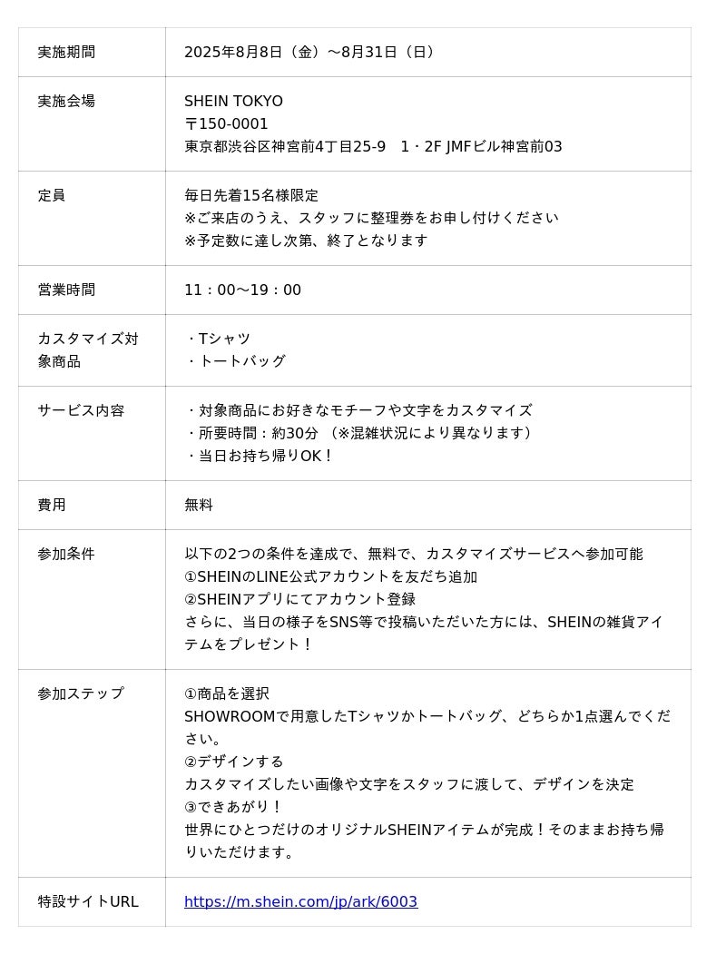 この度「SHEIN(シーイン)」は、東京・原宿に位置するショールーム「SHEIN TOKYO」にて、SHEINアイテムを自分好みにカスタマイズできる期間限定イベント「SHEIN for Meー〈夏休み編〉」を、2025年8月8日(金)~8月31日(日)まで開催いたします。