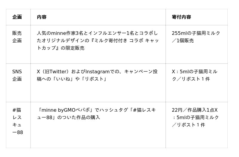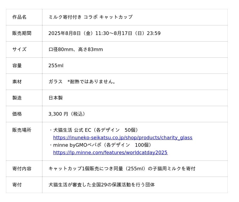 GMOインターネットグループのGMOペパボ株式会社(代表取締役社長:佐藤 健太郎)が運営する国内最大(※1)のハンドメイドマーケット「minne(ミンネ) byGMOペパボ」(URL:https://minne.com/)と、国産・無添加(※2)のプレミアムペットフードの販売をはじめとしたペットケア事業を展開する犬猫生活株式会社(代表取締役 佐藤 淳、以下 犬猫生活、URL:https://inuneko-seikatsu.co.jp/)は、保護猫を支援するチャリティ企画『キャットカップキャンペーン』(URL:https://lp.minne.com/features/worldcatday2025)を「世界猫の日」である2025年8月8日(金)より開始いたします。本企画では、保護猫支援を目的に販売企画とSNS企画を実施し、犬猫生活が審査した全国29の保護活動を行う団体に寄付を行います。