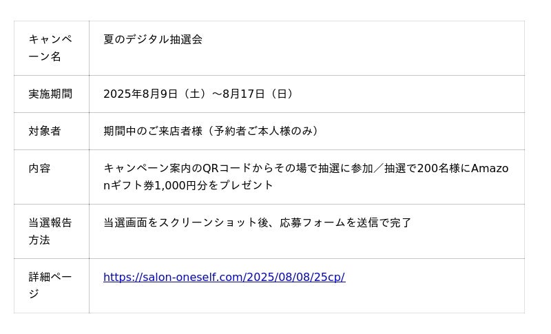 この夏、ONESELFは、そんな“夏の自分磨き”をもっと楽しく、もっとワクワクさせるべく、全国の来店者向けに 「夏のデジタル抽選会」を開催いたします。