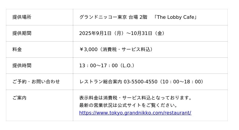 「東京を楽しむ 東京をくつろぐ」ひとときをお届けするグランドニッコー東京 台場(住所:東京都港区 総支配人:塚田 忠保)は、吹き抜けのロビーフロアに心地よい光が降り注ぐ「The Lobby Cafe」にて、芳醇な甘みと紫緑の彩りを楽しむ「シャインマスカットと巨峰のパフェ」を2025年9月1日(月)~10月31日(金)の期間で提供いたします。