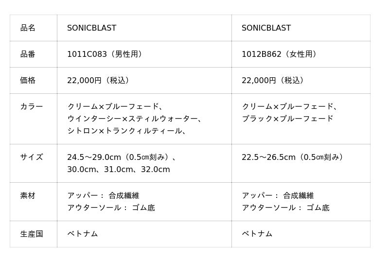 「SONICBLAST(ソニックブラスト)」は、クッション性と反発性が特徴のランニングシューズで、安定性と反発性をもたらす樹脂プレート「ASTROPLATE(アストロプレート)」をミッドソール内部に搭載しています。スピードトレーニング用におすすめで、重量は約256グラム(27.0cm/片足重量)です。