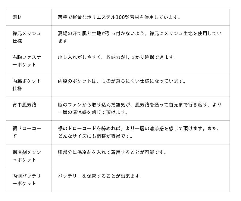 屋外での作業時はもちろんながら、室内の暑さ対策や、タウンユース、アウトドア、キャンプ、フェス、スポーツ観戦など、夏の様々なシーンでお使いいただけます。
