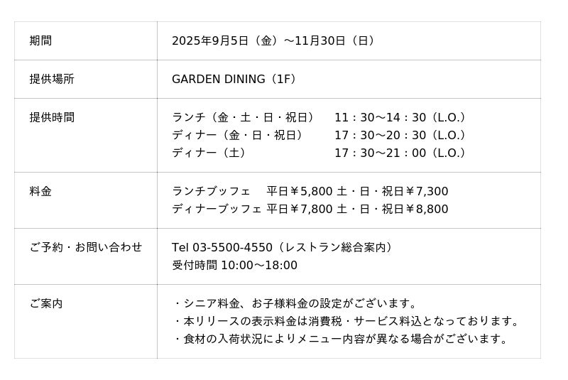 「東京を楽しむ 東京をくつろぐ」ひとときをお届けするグランドニッコー東京 台場(住所:東京都港区 総支配人:塚田 忠保)は、緑と光が溢れる開放的なブッフェレストラン「GARDEN DINING」にて、北海道の豊かな自然が育んだ旬の食材を存分にお楽しみいただける『北海道フェア』を2025年9月5日(金)~11月30日(日)の期間限定で開催いたします。