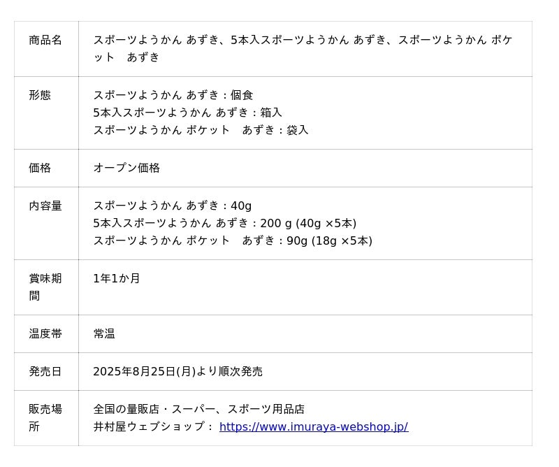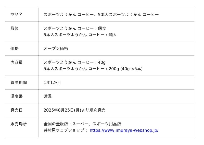 井村屋株式会社(本社:三重県津市高茶屋七丁目1番1号、社長:岩本 康)は、スポーツシーンに最適な『スポーツようかん あずき(個食、5本入、ポケット)』、『スポーツようかん コーヒー(個食、5本入)』を2025年8月25日(月)より全国にて順次発売します。