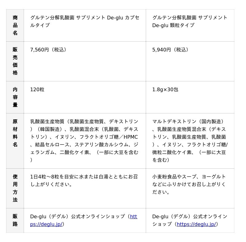 「De-glu(デグル)」は、韓国の伝統的な発酵食品から発見・開発された最大約70%のグルテン分解機能を持つ乳酸菌(※1)を配合した自社ブランドのサプリメントです。幅広いシーンでご使用いただけるよう、カプセルタイプと顆粒タイプの2種で展開します。