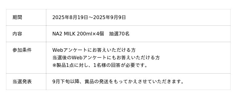 NA2 MILKプレゼントキャンペーン実施中!アンケートに答えて、話題のA2ミルクを体験しよう! 期間:2025年8月19日~2025年9月9日