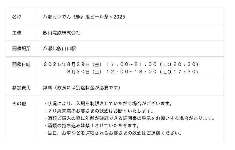 プラットホームを「ビアホーム」、停車した電車を「ビアトレイン」と名付け、普段体験できない場所でおいしい地ビールと地ビールによく合う各種フードをお楽しみいただけます。