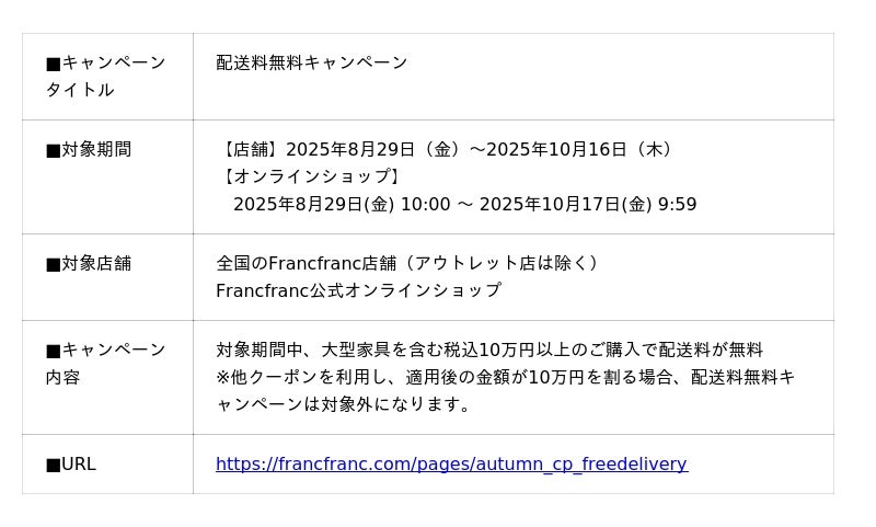 Francfrancではこの秋に新生活を迎える皆さまを応援する企画として、8月29日(金)~10月16日(木)の期間中、大型家具を含む税込10万円以上をご購入のお客様を対象に、家具や雑貨などの新生活アイテムをお得に買い揃えられる「配送料無料キャンペーン」を実施します。
