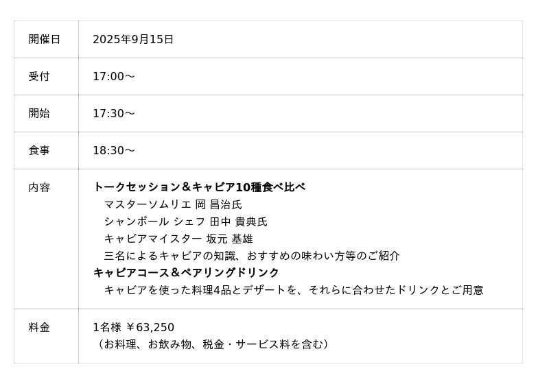 国内では類を見ないキャビア食べ比べをはじめ、キャビアや料理に合わせたワインとの共演など、キャビアマイスターやソムリエやシェフの話を交えながら味わう『究極の至福のひと時』を存分にお愉しみくださいませ。
