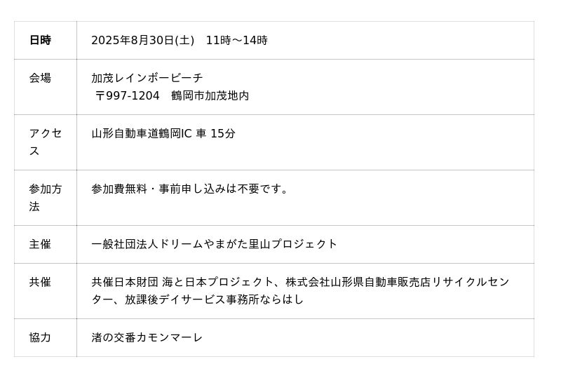一般社団法人 ドリームやまがた里山プロジェクトは、2025年8月30日(土)に「ユニバーサルビーチin加茂レインボービーチ」を開催いたします。障がい者も健常者も一緒に楽しむことができるイベントです。このイベントは、次世代へ豊かで美しい海を引き継ぐために、海を介して人と人とがつながる“日本財団「海と日本プロジェクト」”の一環です。