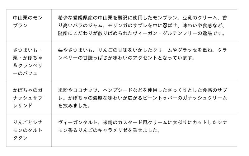 この秋冬シーズンに提供する「Vegan Afternoon Tea」は、愛媛県の希少な「中山栗」を贅沢に使用した「ヴィーガンモンブラン」を筆頭に、すべて動物性の食材を使用せずに作り上げたスイーツ8種、セイボリー4種をご用意しました。スイーツはヴィーガンモンブランをご提供するほか、栗といちじくのスコーンや自家製ビーントゥバーを使用したサブレサンド、フィナンシェなど、ペストリーシェフ・石和悟(いしわさとる)のヴィーガンスイーツへのこだわりが随所に散りばめられた品々がお皿を彩ります。セイボリーは、ひよこ豆のスープカレーやヴィーガンサーモンを用いたピンチョスなどが並び、すべてヴィーガンでありながら食べ応えのある一品一品をご堪能いただけます。