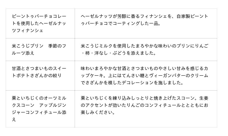 ペストリーシェフ 石和 悟より2022年よりヴィーガンのアフタヌーンティーの提供を始め、今ではヴィーガンの方だけでなく乳製品や卵のアレルギーをお持ちの方にもご好評をいただくメニューとなりました。生クリームや卵などの動物性の食材を使わずとも、遜色ない味わいや食べ応えをお楽しみいただけるように一品一品にこだわりを凝縮させました。ぜひご賞味いただければ幸いです。