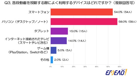 – 最も多かったのは「パソコン(デスクトップ・ノート)」で、全体の58%(58人)を占めました。パソコンでの視聴は、大画面で映像を楽しめる点や、作業をしながら同時に視聴しやすい点が理由として考えられます。