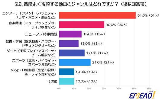 – 最も多かったのは、「エンターテイメント(バラエティ・ドラマ・アニメ・映画など)」で、全体の51%(51人)を占めています。これは、動画視聴の中でエンターテイメント関連コンテンツが圧倒的に人気を集めていることを示しており、視聴者が娯楽を目的として動画を消費していることがわかります。