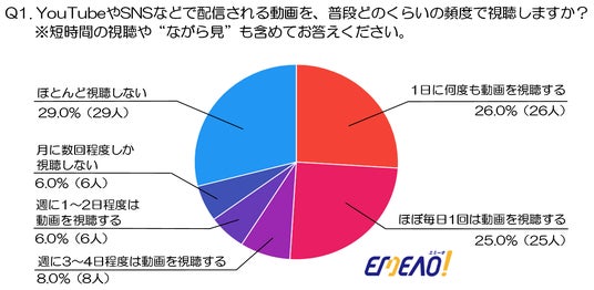 – 次いで「ほぼ毎日1回は動画を視聴する」(26%/26人)と「1日に何度も動画を視聴する」(25%/25人)が続いており、合計すると約半数が毎日動画を視聴している層となり、動画視聴が日常的なルーチンの一部となっていることを示唆しています。