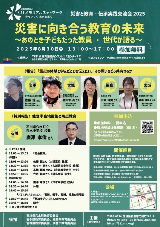 公益社団法人3.11メモリアルネットワークは、震災を起点とした学校現場での防災学習・震災伝承の実践事例を共有する「災害と教育 伝承実践交流会2025」を、8月30日にTKP仙台青葉通カンファレンスセンター(仙台市青葉区)およびオンラインで開催します。