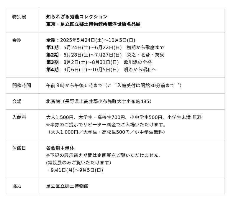 北斎館50周年記念事業として、4期に分けてご紹介してきた特別展「知られざる秀逸コレクション 東京・足立区立郷土博物館所蔵浮世絵名品展」も最後の展覧会となりました。普段なかなか見ることのできない、足立区立郷土博物館所蔵の充実した浮世絵コレクションを一同に見ることのできる貴重な機会ですので、ぜひこの機会に小布施 北斎館へご来館ください。