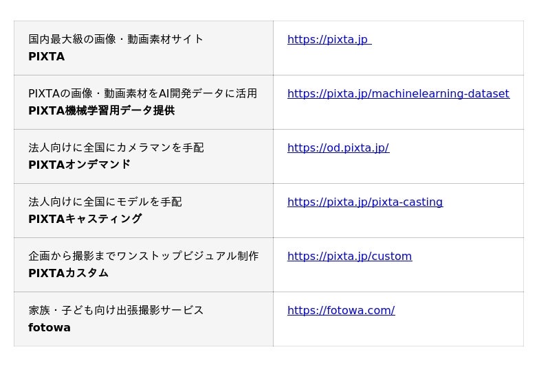 事業内容:デジタル素材のオンラインマーケットプレイス「PIXTA」の運営、法人向け出張撮影・カメラマンサービス「PIXTAオンデマンド」の運営、出張撮影プラットフォーム「fotowa」の運営