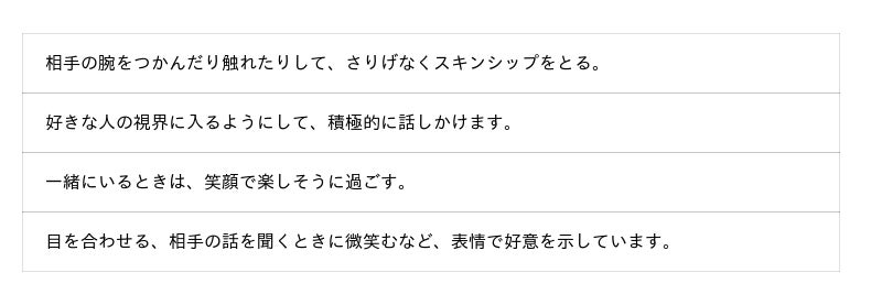 女性は軽く相手に触れたり、笑顔で話したりするなど、表情や態度でさりげなく好意を示すことが多いようです。