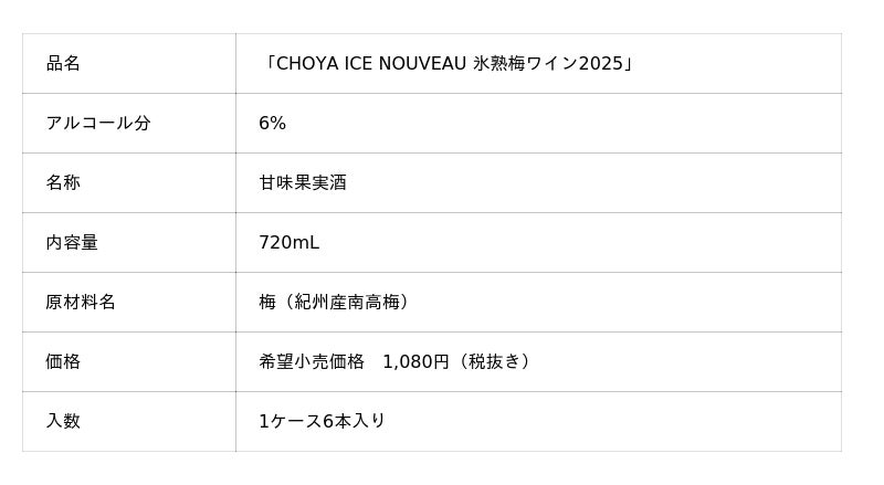 チョーヤ梅酒株式会社(本社:大阪府羽曳野市、社長:金銅重弘、以下チョーヤ)は、2025年収穫の紀州産完熟南高梅を醸造した梅ワイン「CHOYA ICE NOUVEAU(チョーヤ アイス ヌーボー) 氷熟梅ワイン2025」を2025年9月16日(火)から約68,000本の数量限定で全国新発売いたします。