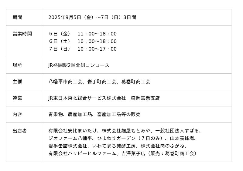 JR東日本東北総合サービス株式会社(本社:宮城県仙台市、代表取締役社長:弭間 俊則、以下「LiViT」)は、地域活性化の取り組みの一環として、北緯40°線上にある岩手県八幡平市・岩手町・葛巻町の3つの商工会と連携し「北緯40°物産販売会」を初開催します。青果物、農産加工品・畜産加工品などの販売を通じ「八幡平市・岩手町・葛巻町の魅力」を発信します。ぜひ、この機会にJR盛岡駅にお越しください。