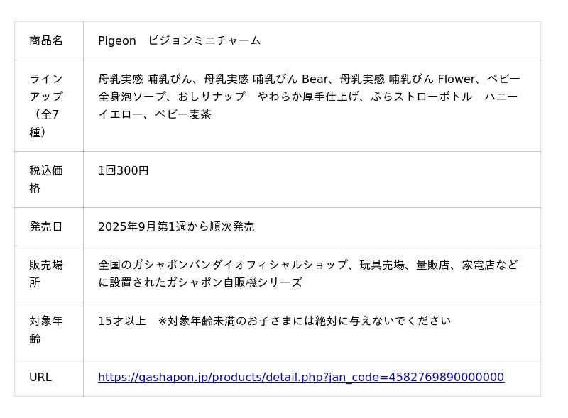 ピジョン株式会社(本社:東京、社長:矢野 亮)が販売する、国内市場シェアNo.1(※1)の哺乳びん「母乳実感(R)」をはじめとする大人気育児用品7種をミニチュアにした「ピジョンミニチャーム」が、株式会社バンダイ(本社:東京、代表:竹中 一博)が展開する「ガシャポン(R)」に2025年9月第1週より順次登場いたします。