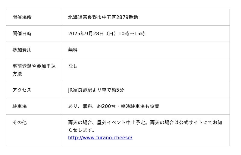 株式会社ふらの農産公社は、2年ぶりとなる「2025富良野チーズ祭り」を2025年9月28日(日)に富良野チーズ工房にて開催します。コロナ禍を経て地域の繋がりを取り戻し、地産地消の魅力を伝える本イベントでは、富良野産生乳100%のチーズや牛乳を使った限定グルメの販売や、ポニー乗馬体験などを実施。入場無料で、富良野市民や観光客の皆様に、家族で楽しめる秋の1日を提供します。