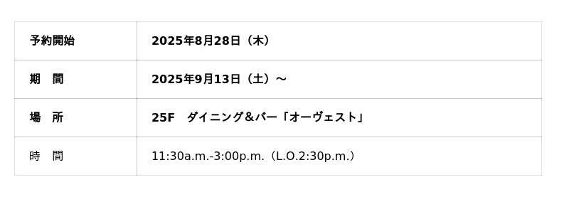 ホテルメトロポリタン(豊島区西池袋1-6-1 総支配人 伊藤茂夫)ダイニング&バー「オーヴェスト」は、9月8日(月)にRenewal Openを迎えます。ホテル最上階、地上100mからの景色をバックにくつろぎのひとときをお過ごしいただけるダイニング&バー「オーヴェスト」では、土日祝日のランチタイム限定コースをご用意いたします。カジュアルなお祝いごとやプチ贅沢な会食に最適なコース料理「Felice(フェリーチェ)」は、前菜・パスタ・メインディッシュ・デザートの全4品をお楽しみいただけます。季節の食材を使用した料理にホテルパティシエ特製のデザート盛り合わせなど、こだわりが詰まったコース料理になっています。カクテルやソムリエ厳選のワインはもちろん、ローアルコールやノンアルコールのお酒なども多彩にご用意していますので、シーンやお料理に合わせてぜひご利用ください。