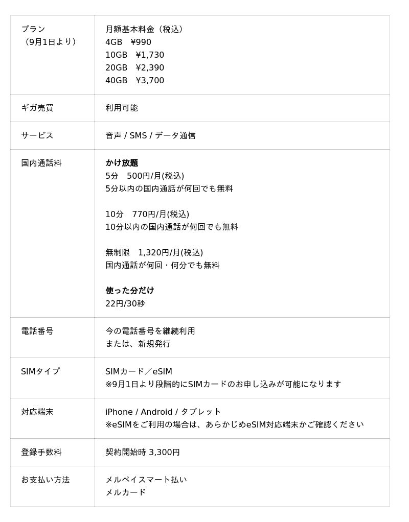 「メルカリモバイル」は2GB(月額990円)/20GB(月額2,390円)の2プランを提供しておりましたが、よりご自身にあったプランをお選びいただけるよう4GB / 10GB / 20GB / 40GBの4プランに刷新いたします。4GBプランは元の2GBプランの価格を据え置きながら容量を倍に増やし、より始めやすい新料金プランにリニューアルしました(※4)。これまで好評だったギガ売買は新料金プランでも引き続きご利用が可能で、拡大した4つの新料金プランとギガ売買により、お客さまにとってより柔軟な選択ができるようになりました。