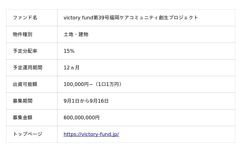 カチデベロップメント株式会社(本社:東京都中央区 代表取締役:澤田 三喜男 以下、カチデベロップメント)は完全オンライン完結型の総合不動産投資プラットフォームサービス「victory fund」において、2025年9月1日より想定利回り15%・運用期間12ヵ月の福岡ケアコミュニティ創生プロジェクト(以下、「本プロジェクト」といいます。)の募集開始予定です。福岡県福岡市に位置する鉄筋コンクリート造の介護・医療施設が投資対象となり、victory fundでは2021年3月から募集してきた中で過去最大規模の案件となります。