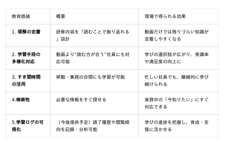 そこでmanebiは、“読む”教材の活用を強化。すき間時間での復習や、自分のペースで深める学びを後押しし、研修効果を実務の成果へつなげます。