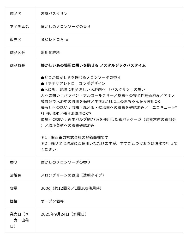 株式会社バスクリン(本社:東京都千代田区 社長:三枚堂正悟)は、石塚硝子株式会社(本社:愛知県岩倉市 社長:石塚久継)が展開するグラスウェアシリーズ「アデリアレトロ」とデザインコラボレーションした入浴料「喫茶バスクリン 懐かしのメロンソーダの香り」を9月24日(水曜日)より数量限定発売いたします。 “レトロかわいい”パッケージに、当社の調香師がブレンドした、どこか懐かしい「メロンソーダの香り」を組み合わせた本品は、昭和レトロの魅力をぎゅっと詰め込んだ、特別なバスタイムを演出します。