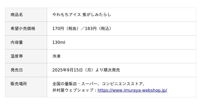 井村屋株式会社(本社:三重県津市高茶屋七丁目1番1号、社長:岩本 康)は、アイスの人気ブランドである「やわもちアイスシリーズ」より、過去に人気を博した季節限定商品『やわもちアイス 焦がしみたらし』をリニューアルし、2025年9月15日(月)から季節限定で発売します。