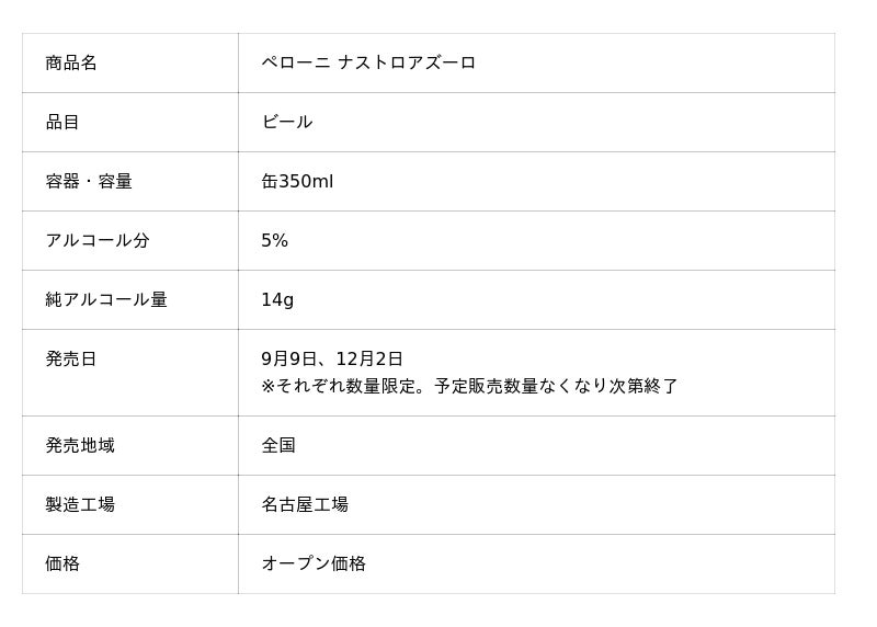 アサヒビール株式会社(本社 東京、社長 松山一雄)は、イタリアンプレミアムビール※1で世界売上No.1※2の「ペローニ ナストロアズーロ(以下、ペローニ)」の缶350mlを、9月9日と12月2日に数量限定で発売します。日本で缶商品を展開するのは初めてです。