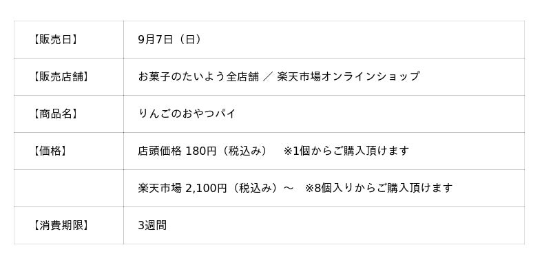 株式会社太陽社(所在地:千葉県匝瑳市飯倉293、代表取締役:片岡正裕)が展開する千葉県で長年愛される菓子店「お菓子のたいよう」は、9月7日(日)より秋限定『りんごのおやつパイ』を発売いたします。本商品は、りんごが最もおいしい旬の時期にだけお届けする数量限定商品です。