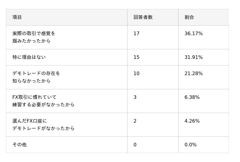 – デモトレードを利用した理由として最も多かったのは「いきなり実際の資金で取引することにリスクを感じたから」(43.55%)。投資による資金減少を不安に思う人は少なくないといえる。