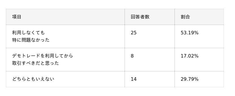 – 「デモトレードの利用が実際の取引に役立った」と回答した人は合計8割以上。デモトレードの利用満足度は高いといえる。