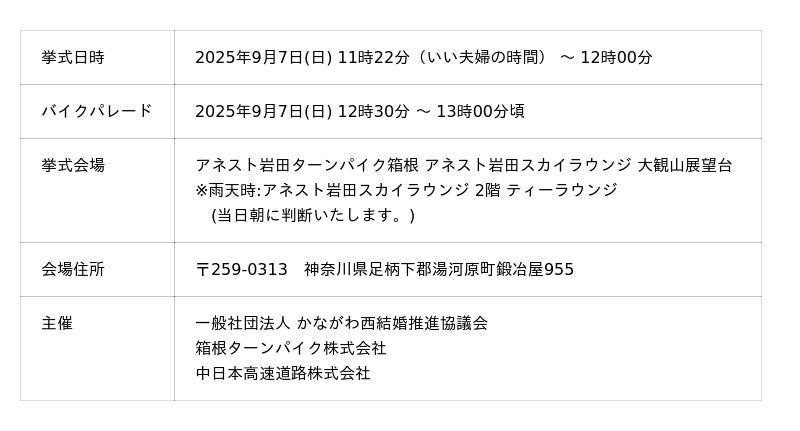 本式は、一般社団法人かながわ西結婚推進協議会と箱根ターンパイク株式会社(本社:神奈川県小田原市)、中日本高速道路株式会社(本社:愛知県名古屋市)が主催し、バイクを愛するカップルにターンパイクの絶景を舞台にした特別な挙式を贈る取り組みです。