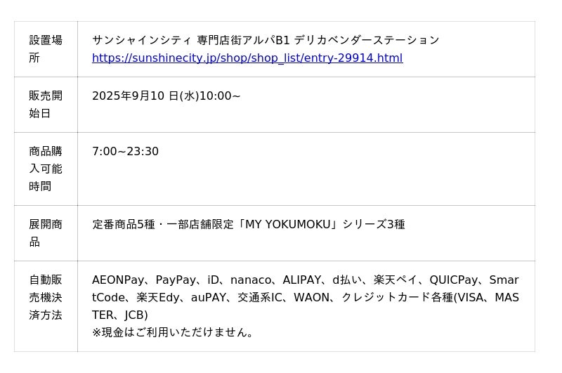 株式会社ヨックモック(本社:東京都千代田区、代表取締役:藤縄 武士)は、実店舗の営業時間外でもヨックモックの定番商品を購入できる自動販売機「いつでもヨックモック」を池袋・サンシャインシティに2025年9月10日(水)より設置いたします。第4弾となる今回は、年間3,000万人を超える来街者数を誇る池袋の「サンシャインシティ」へ出店。ロッカー型ユニットを新規導入し、定番クッキーが食べきりサイズの可愛い紙箱に入った『 MY YOKUMOKU 』シリーズから、贈答用にもなるアソート詰め合わせまで、幅広いシーンでご活用いただけるラインナップをご用意します。お仕事帰りのちょっとした自分へのごほうびや、取引先への手土産にも「いつでもヨックモック」で気軽に当社のお菓子をお楽しみください。