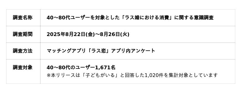 株式会社ラス恋(アイザックグループ/本社:東京都渋谷区/代表取締役CEO:山口 昂星)が運営する、対象年齢が40歳以上の恋活・婚活マッチングアプリ「ラス恋」は、2025年8月、アプリユーザー1,671名を対象に“最後の恋(ラス婚)”に関する意識調査を実施しました(監修:中央大学文学部 教授 山田昌弘)。
