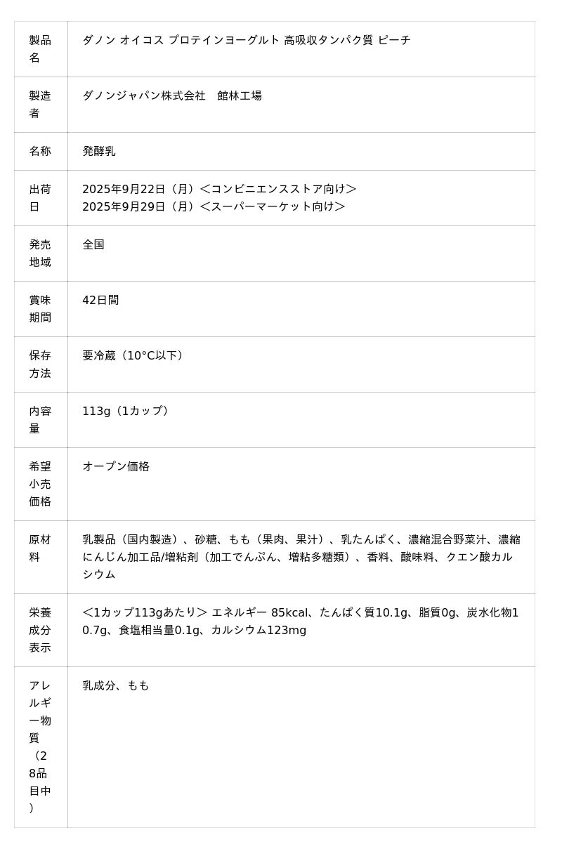 ダノンジャパン株式会社(本社:東京都目黒区、代表取締役社長:ロドリゴ・リマ、以下ダノンジャパン)は、カラダを動かすすべての人の良質なタンパク質補給を応援する「ダノン オイコス」ブランドより、「ダノン オイコス プロテインヨーグルト 高吸収タンパク質 ピーチ」を発売します。2025年9月22日(月)より全国のコンビニエンスストア向けに、9月29日(月)より全国のスーパーマーケット向けに出荷を開始します。当製品は、ヨーグルトのフレーバーとして幅広い世代から支持されるピーチを採用し、やさしい香りと果肉のみずみずしい風味が引き立つ、甘すぎずさっぱりとした味わいが特長です。