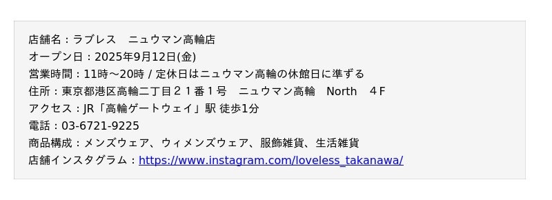 三陽商会が直営・路面店販路にて展開するセレクトショップ「LOVELESS(ラブレス)」は、2025年9月12日(金)に高輪ゲートウェイシティに開業する商業施設「ニュウマン高輪」のNorth 4Fに新しい店舗をオープンいたします。「ラブレス ニュウマン高輪店」では、ショップオリジナルブランドの新作コレクションをはじめ、国内外からセレクトした優れたブランドまで豊富に展開。2023年に刷新したストアコンセプトに基づき、大人の方々に上質な空間でショッピングを楽しんでいただける店舗です。またオープンを記念し、メンズ・ウィメンズの8つのデザイナーズブランドによるスペシャルな別注アイテムをご用意。「ラブレス ニュウマン高輪店」とラブレス公式サイト&ストアにて限定発売いたします。(※オンラインストアは同日9月12日(金)午前11時発売予定/一部アイテム後日発売予定)