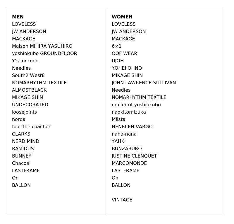 商品は、ウェア、アクセサリーやバッグなどの服飾雑貨を取り揃え、ショップオリジナルブランド「LOVELESS」をはじめ、国内外からセレクトしたブランドで構成。メンズ・ウィメンズ両方のアイテムを展開し、幅広いショッピング体験をお楽しみいただけます。
