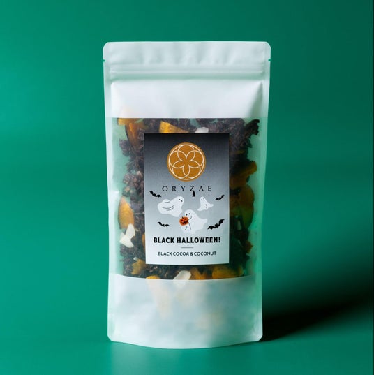 米麹グラノーラ ブラックハロウィンブラックココアとココアパウダーをブレンドした濃厚な味わい。かぼちゃチップやココナッツチップを加え、ハロウィンらしい「黒×オレンジ」のコントラストを楽しめる特別な一品です。