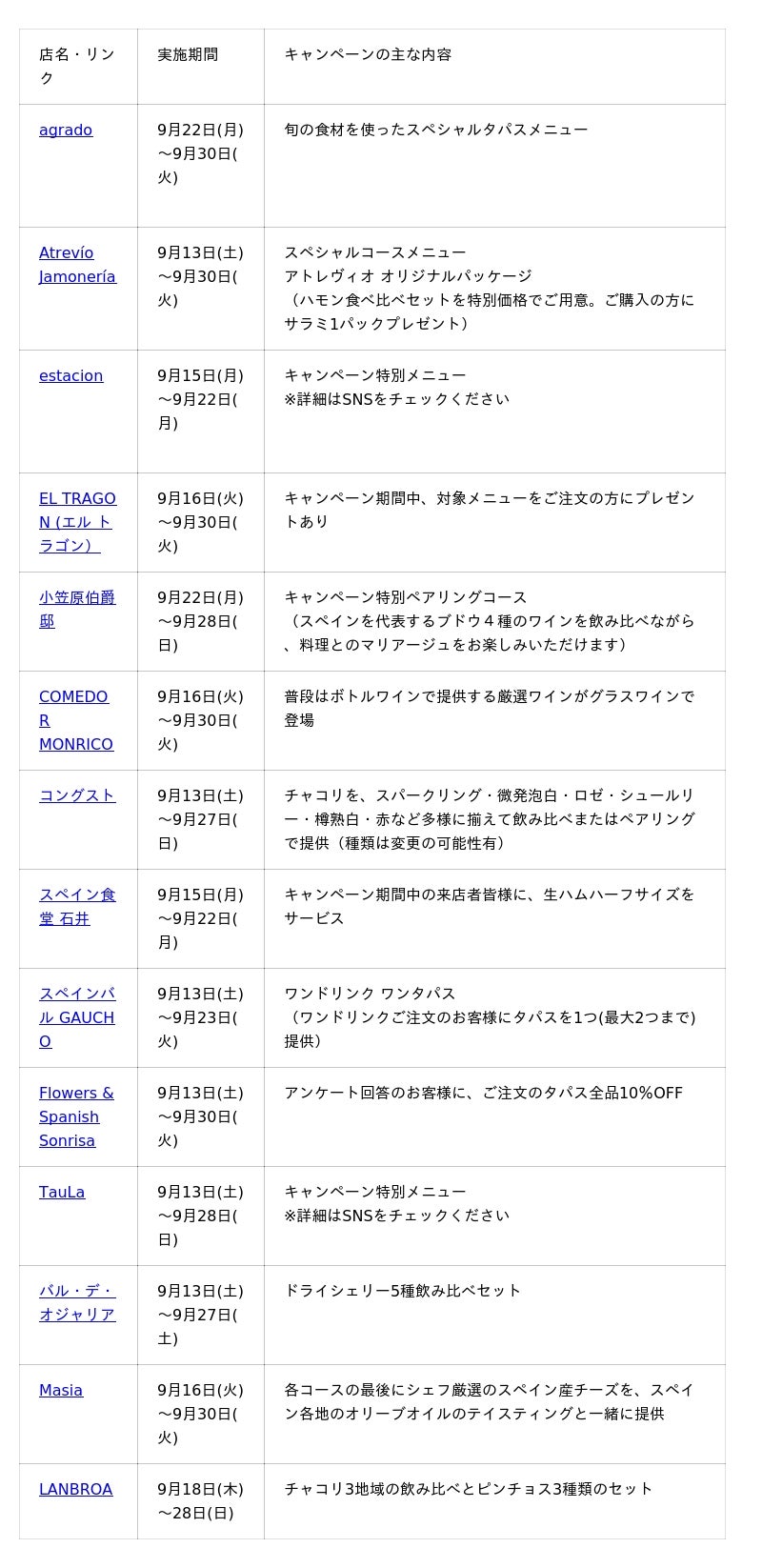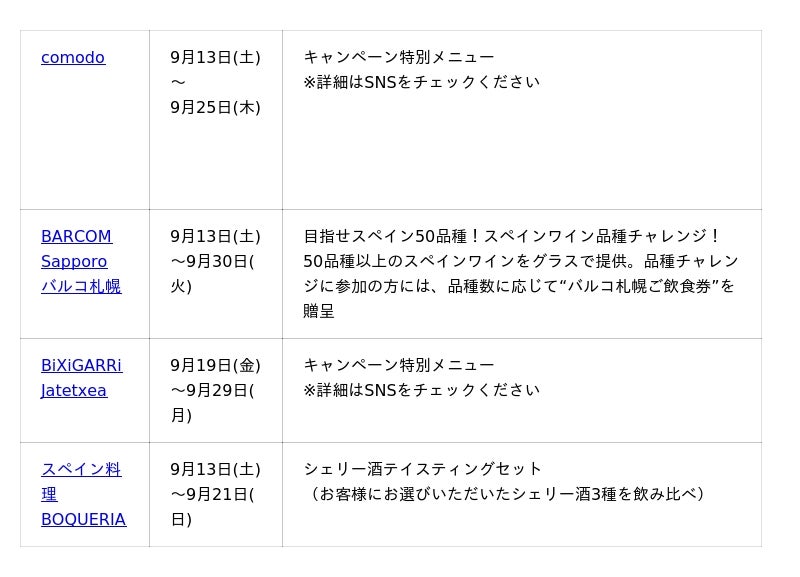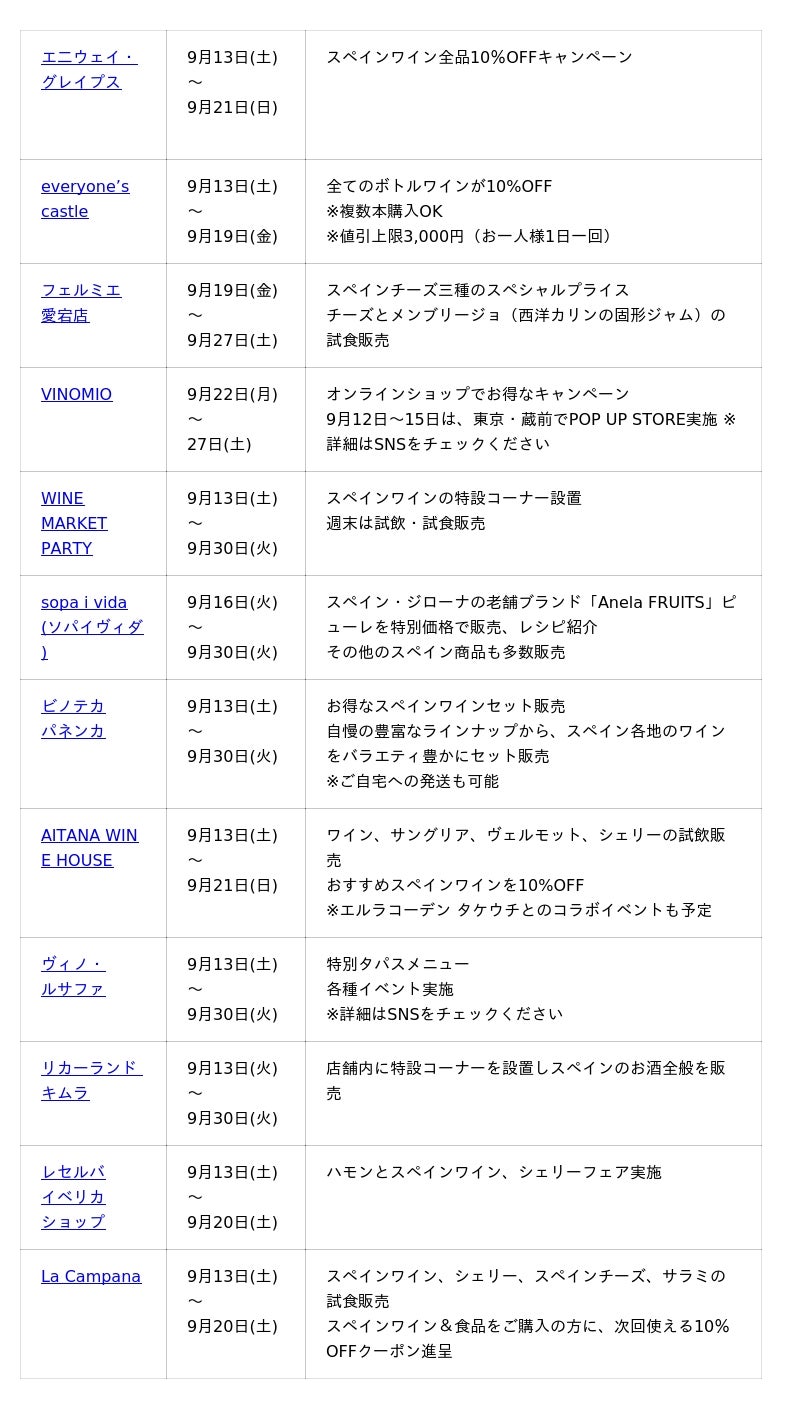 – 主催:スペイン貿易投資庁(ICEX)、各店舗