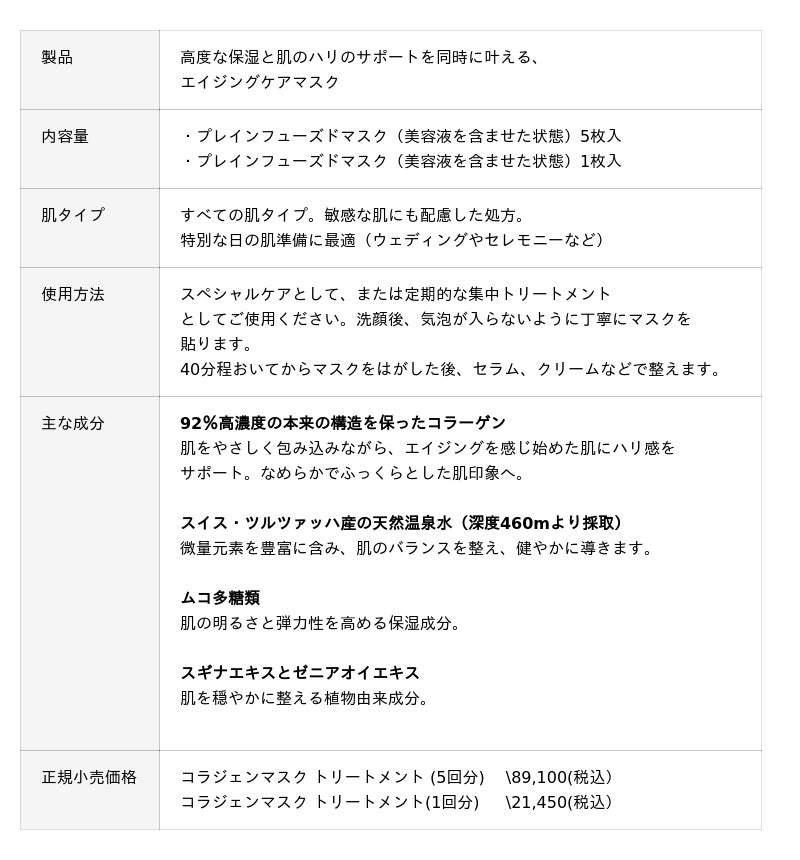 「コラジェンマスク トリートメント」は、92%ピュアで本来の構造を保ったコラーゲンシートを採用、その純度の高さと親和性により、保湿・肌のハリ・弾力を同時に叶えるラグジュアリー トリートメントです。